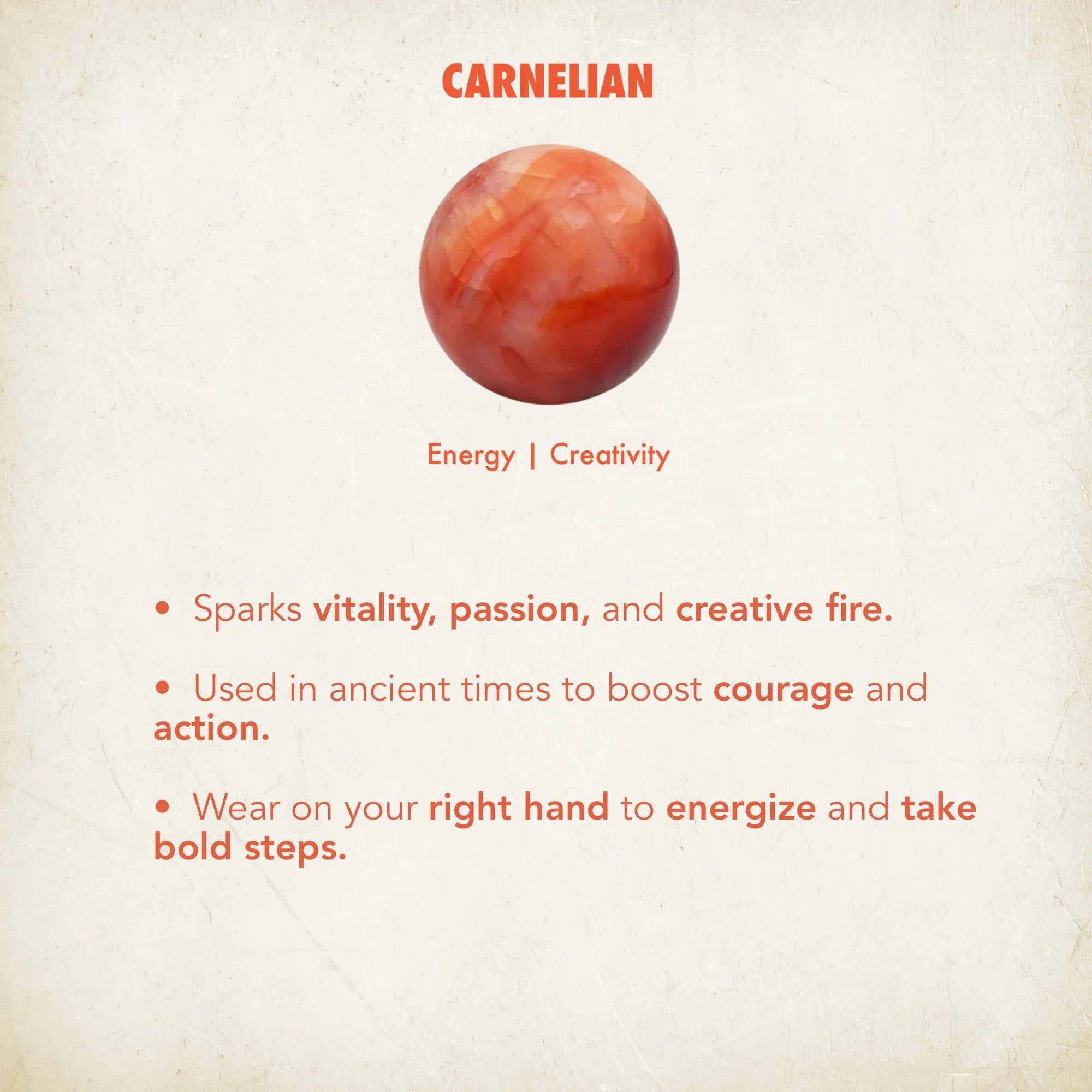 Ancient Egyptians called Carnelian the "Sunset Stone" and used it for protection and vitality. Roman soldiers wore it into battle for courage and strength.