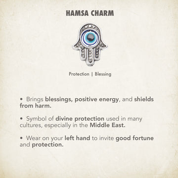 The Hamsa Charm is an ancient symbol shaped like a hand, believed to bring protection, luck, and blessings.