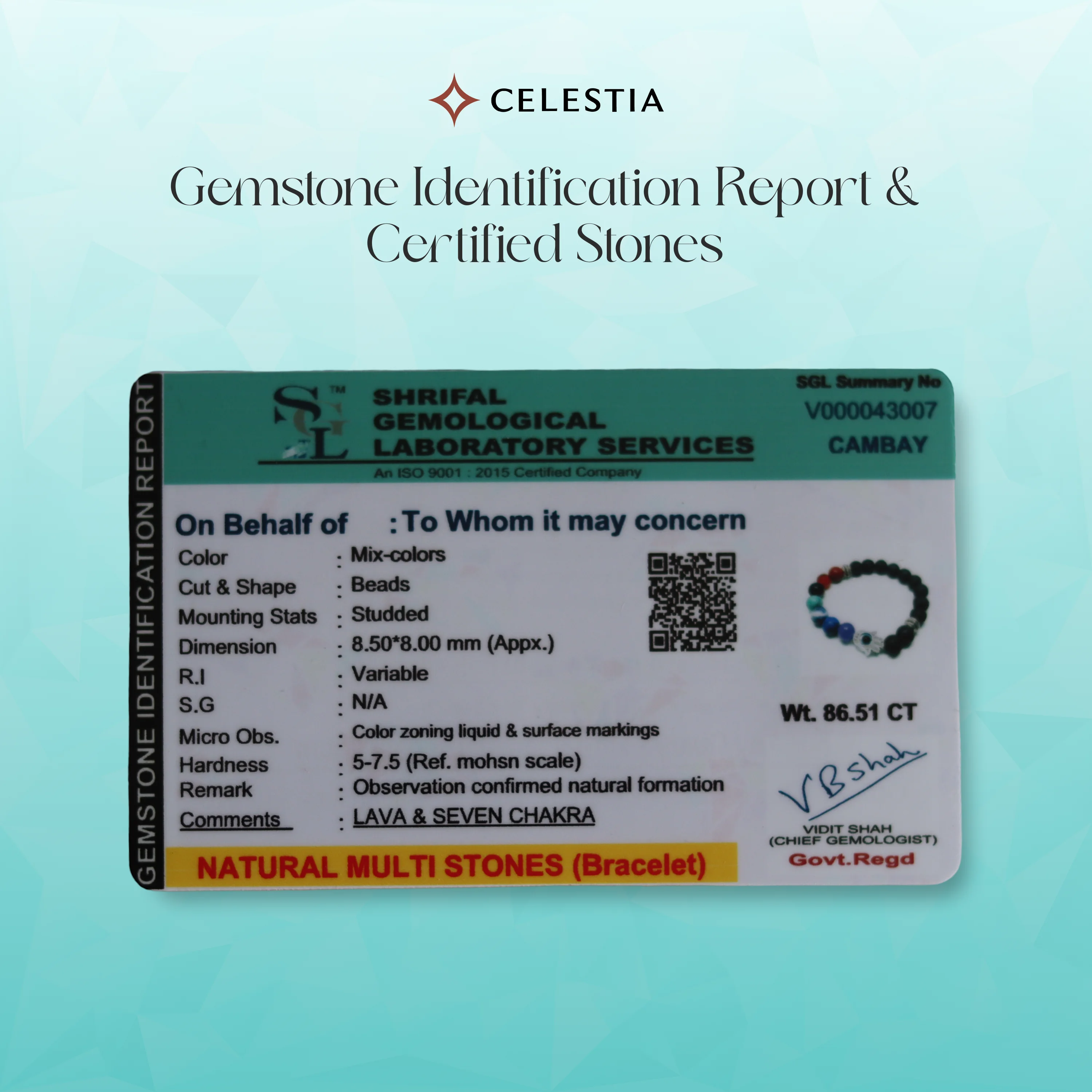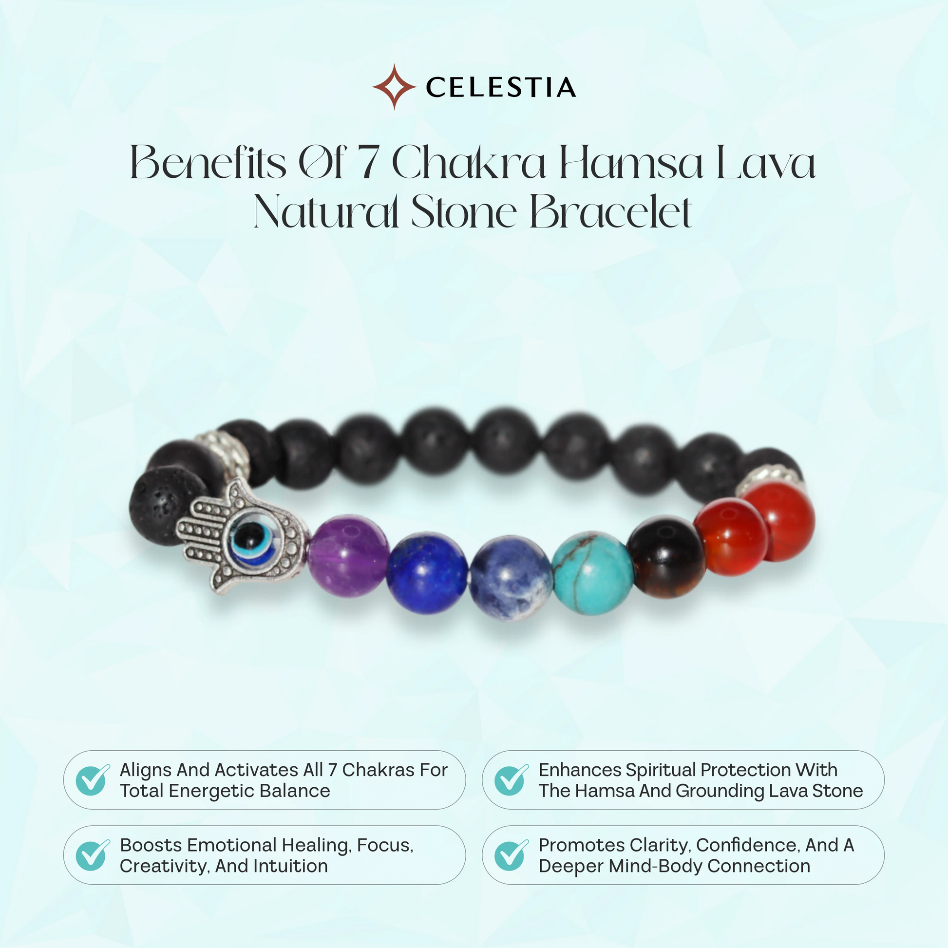 Every Celestia natural stone bracelet is accompanied by an authentication certificate from a renowned lab in India, guaranteeing the authenticity and quality of the chakra stones and lava beads. Whether for personal wellness or as a thoughtful gift, the 7 Chakra Hamsa Lava Natural Stone Bracelet by Celestia blends sacred symbolism with natural beauty. Wear this 7 Chakra Hamsa Lava piece to balance your chakras and embrace protective, grounding energy.