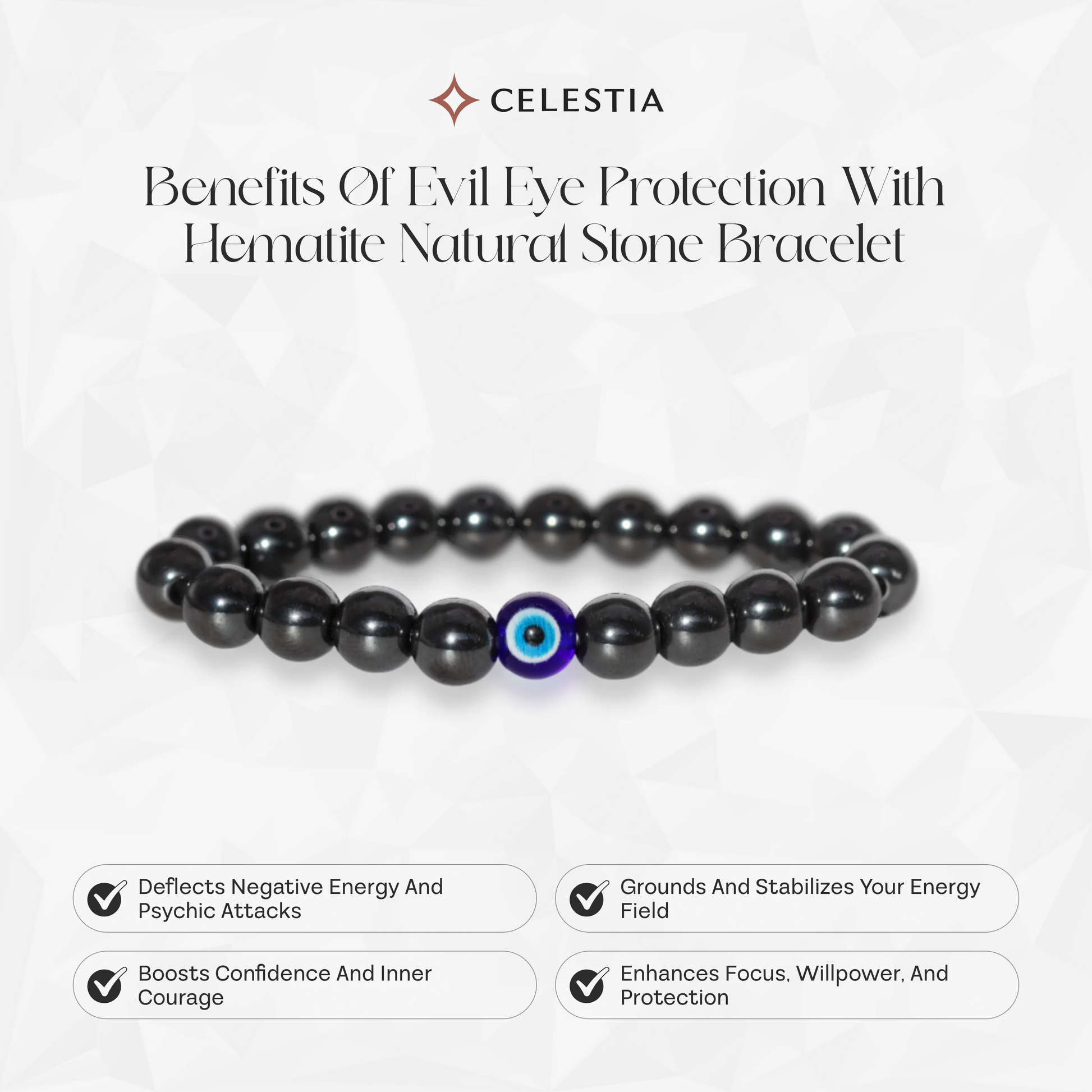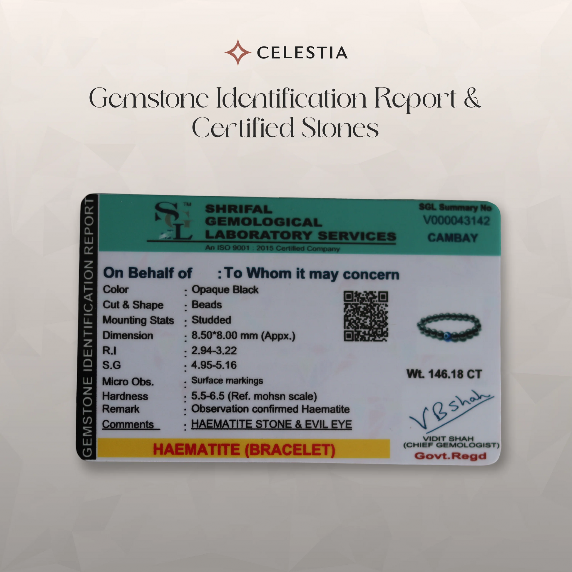 Every Celestia natural stone bracelet is accompanied by an authentication certificate from a renowned lab in India, ensuring the authenticity and quality of the hematite stones and Evil Eye elements. Perfect for personal empowerment or as a thoughtful gift, the Evil Eye Protection with Hematite Natural Stone Bracelet by Celestia merges ancient symbolism with natural beauty. Wear this Evil Eye Bracelet and embrace a life free from negative energies.