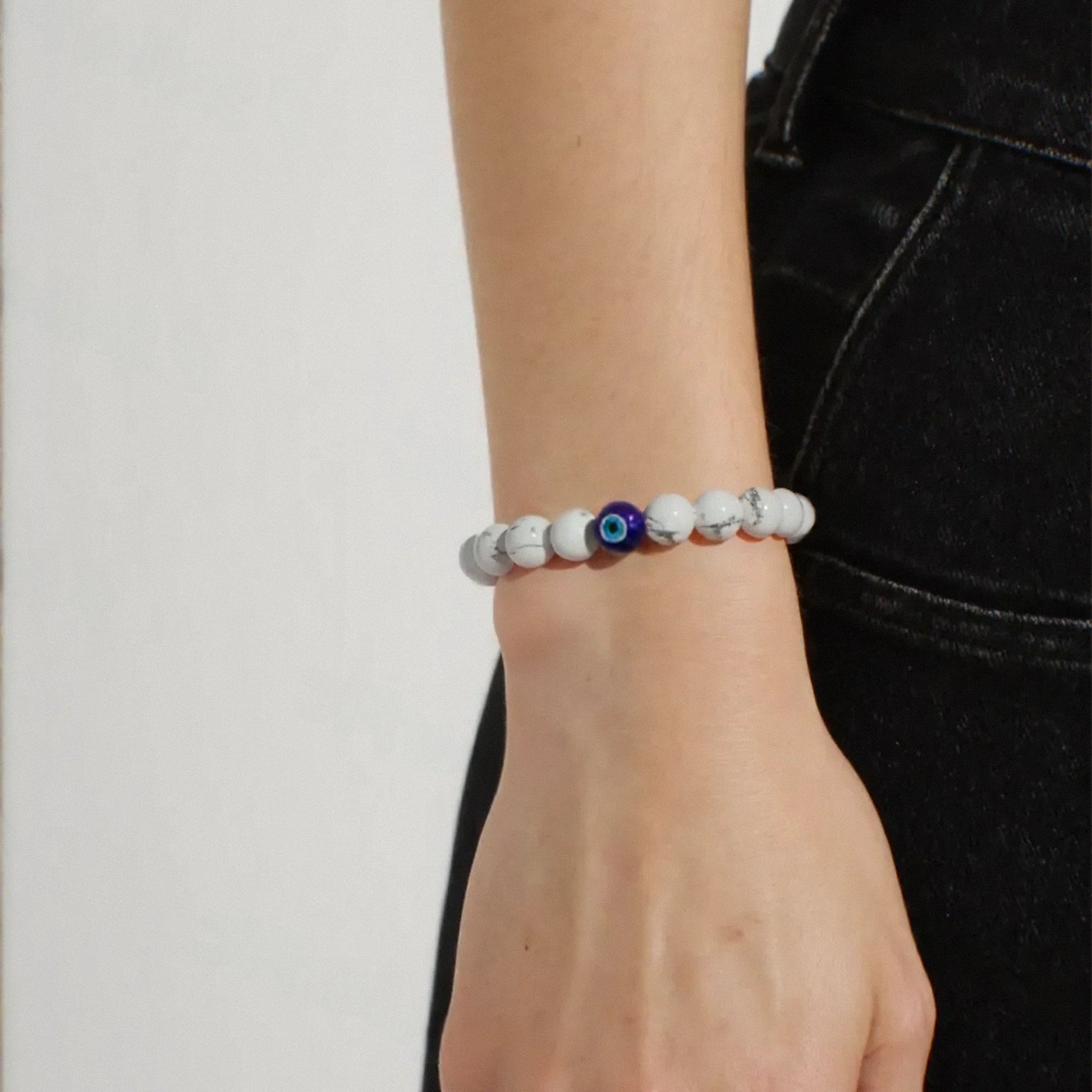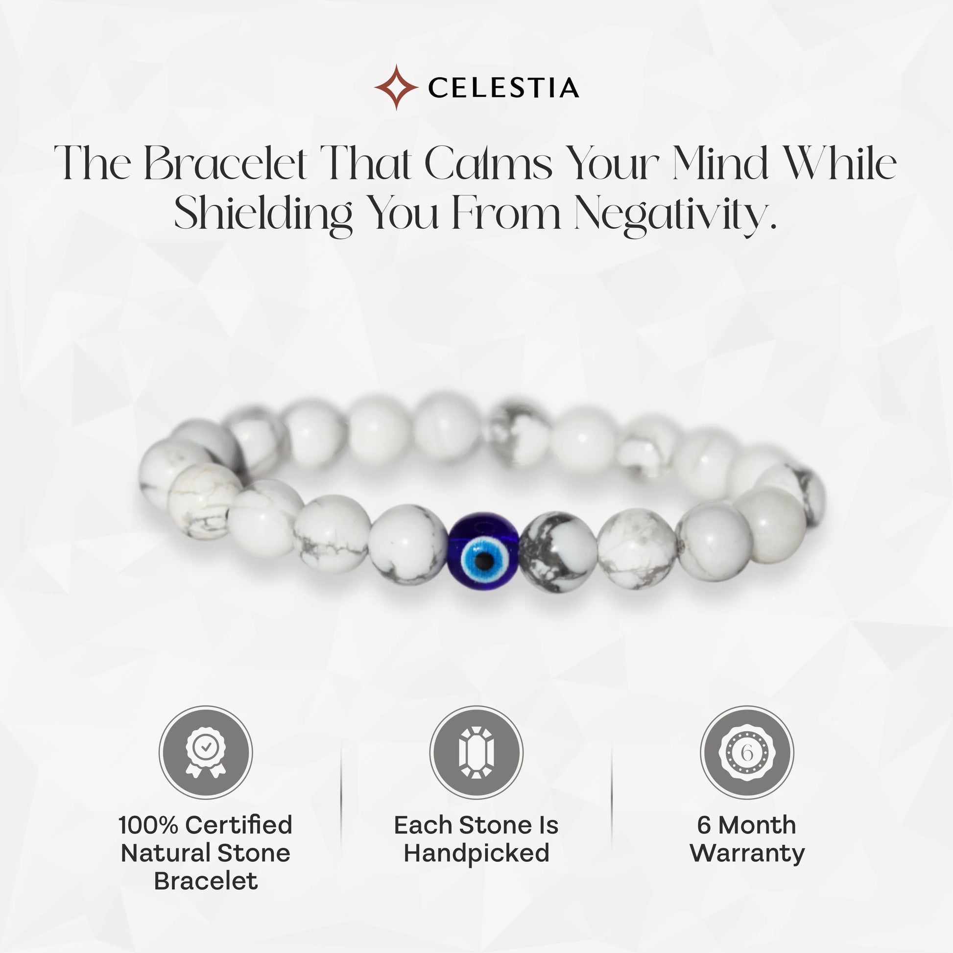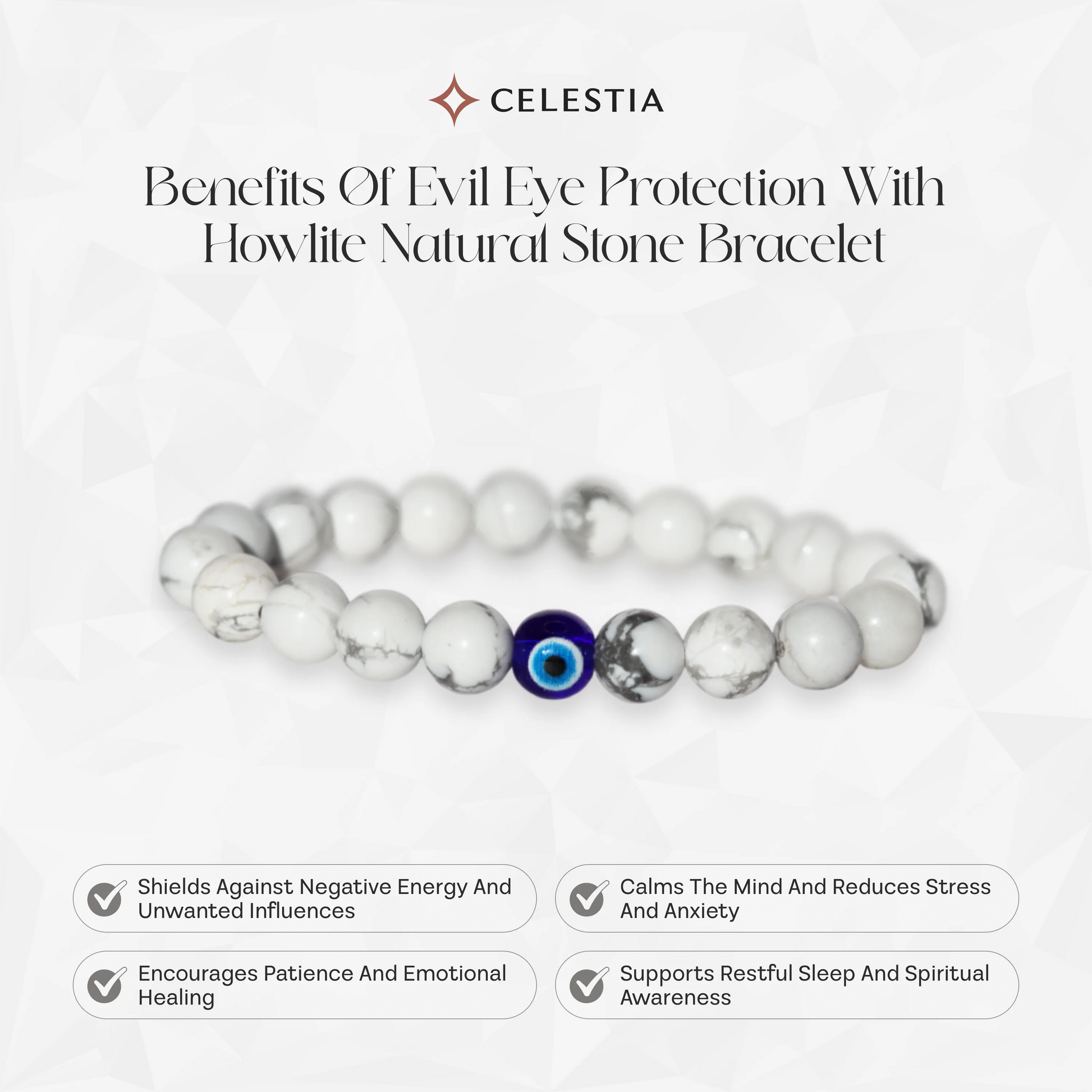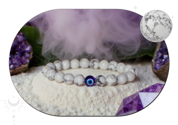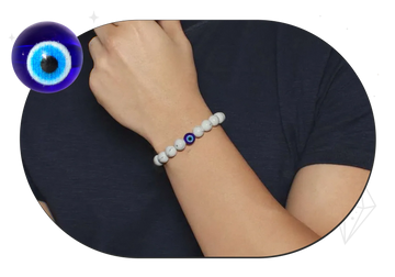 Ward off negativity and invite tranquility with Celestia’s Evil Eye Protection with Howlite Natural Stone Bracelet. Crafted with genuine Howlite stones, known for their calming and stress-relieving properties, this spiritual bracelet helps enhance patience, wisdom, and emotional balance. The striking Evil Eye charm is a powerful symbol of protection, believed to shield the wearer from negativity and bad intentions.