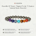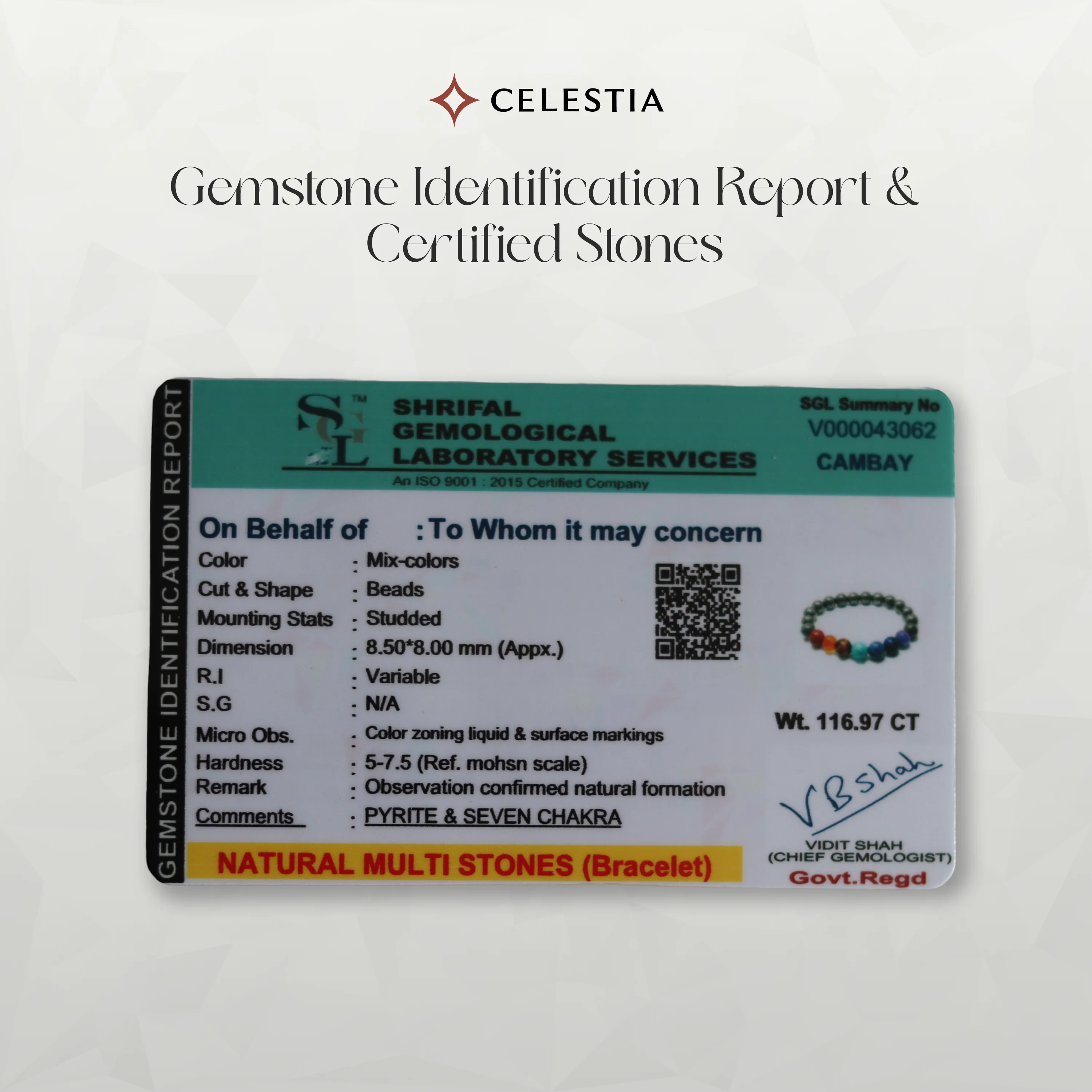 Every Celestia natural stone bracelet is accompanied by an authentication certificate from a renowned lab in India, ensuring the authenticity and quality of the pyrite and 7 Chakra stones. Ideal for personal wear or as a thoughtful gift, the Money Magnet Pyrite 7 Chakra Natural Stone Bracelet by Celestia offers a unique blend of metaphysical benefits and elegance. Wear this 7 Chakra Pyrite bracelet and let abundance flow into your life.