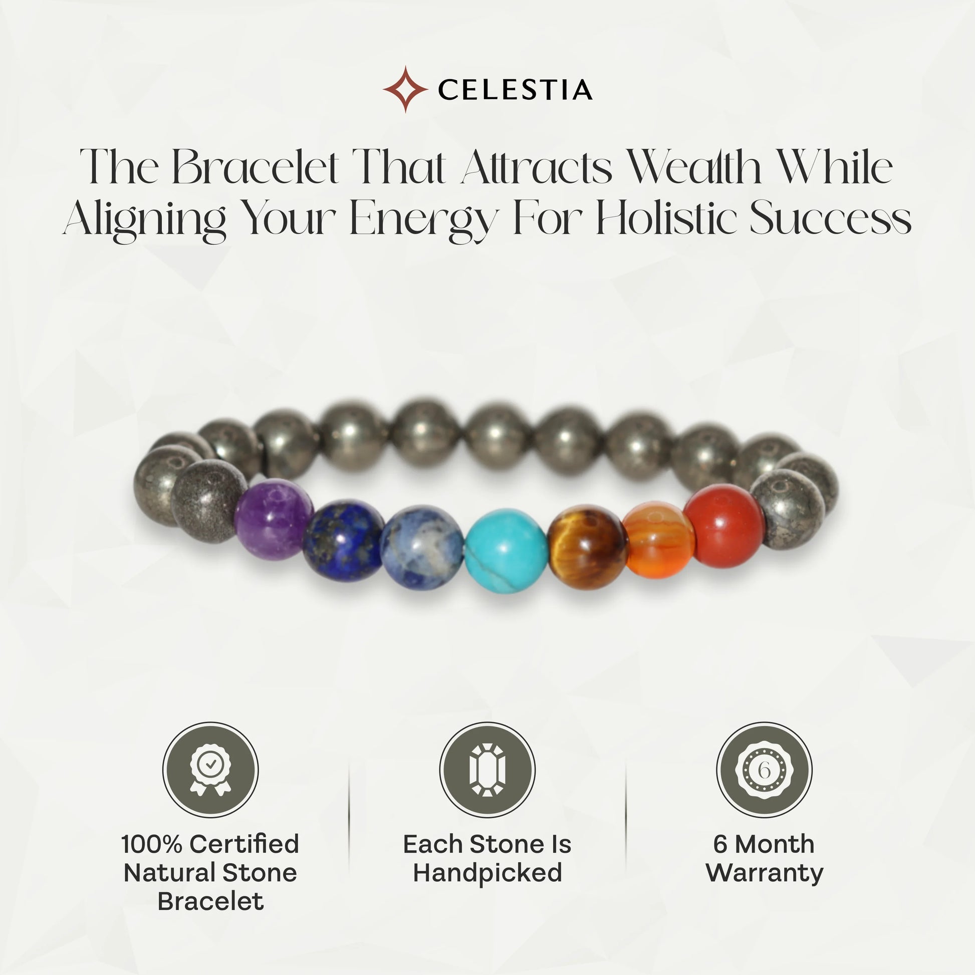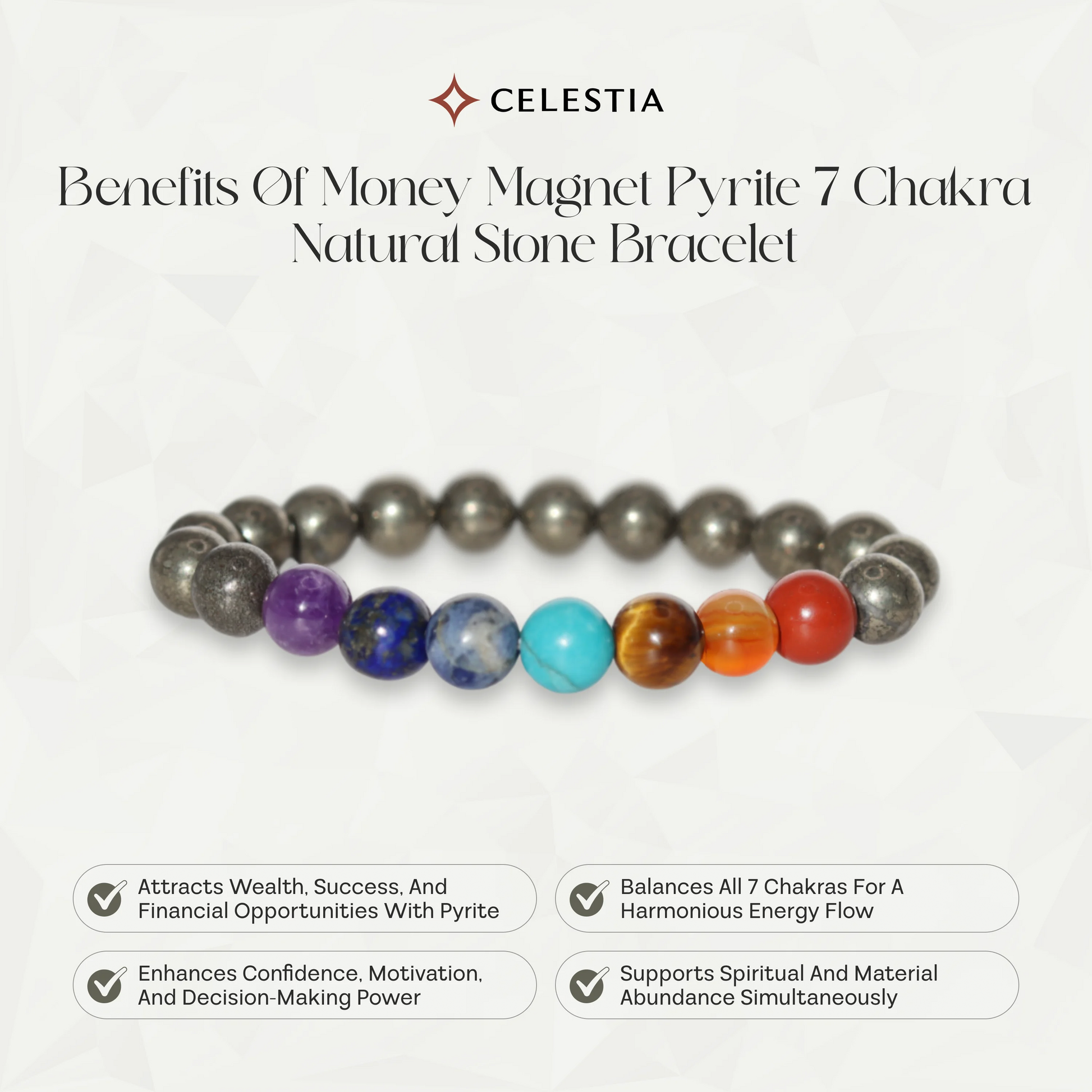 Manifest prosperity and align your energy with the Money Magnet Pyrite 7 Chakra Natural Stone Bracelet from Celestia. This captivating 7 Chakra Pyrite bracelet combines the magnetic power of pyrite—known for attracting wealth—with a vibrant array of seven chakra stones, making it a standout spiritual bracelet. Perfect for those seeking financial success and spiritual equilibrium, this natural stone bracelet is a powerful fusion of intention and style.
