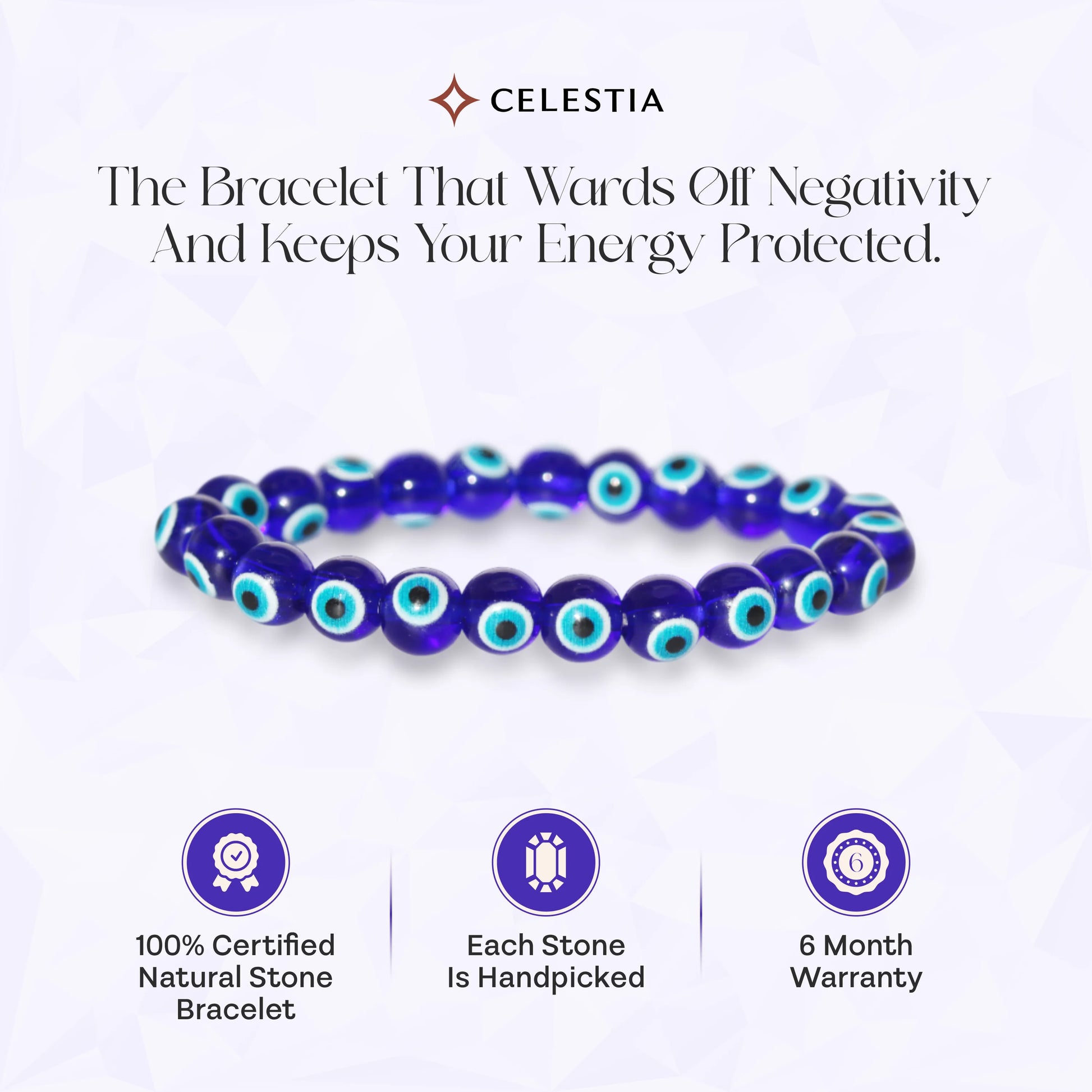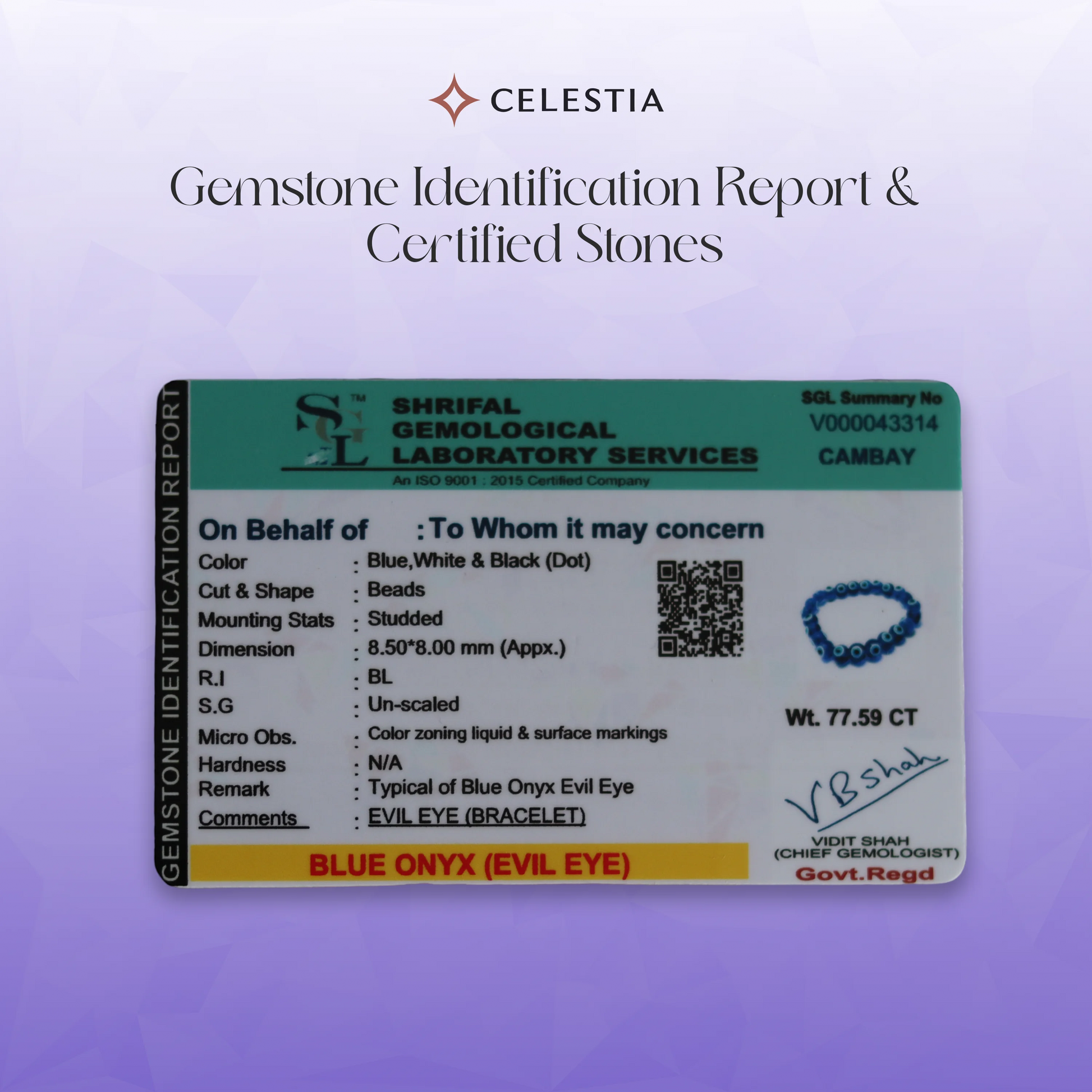 Crafted with high-quality materials, this bracelet seamlessly blends spiritual significance with modern elegance, making it suitable for everyday wear. Whether worn alone or stacked with other natural stone bracelets, it serves as a constant reminder of strength and security. Each bracelet is certified for authenticity by a renowned lab in India, ensuring you receive a genuine, high-quality piece. Elevate your energy and style with Celestia’s exclusive Evil Eye bracelet collection.