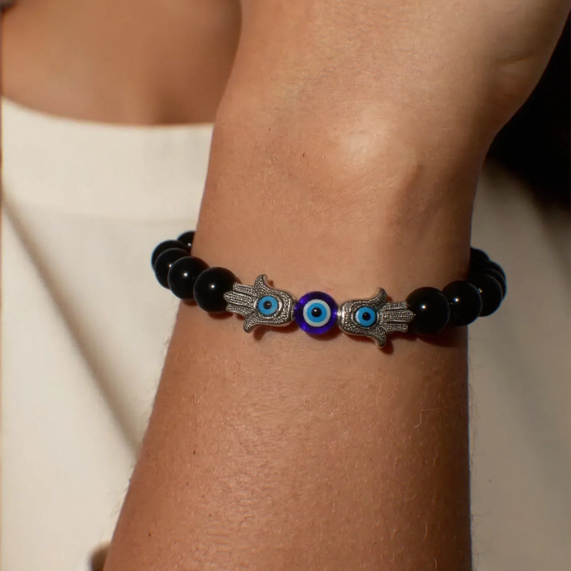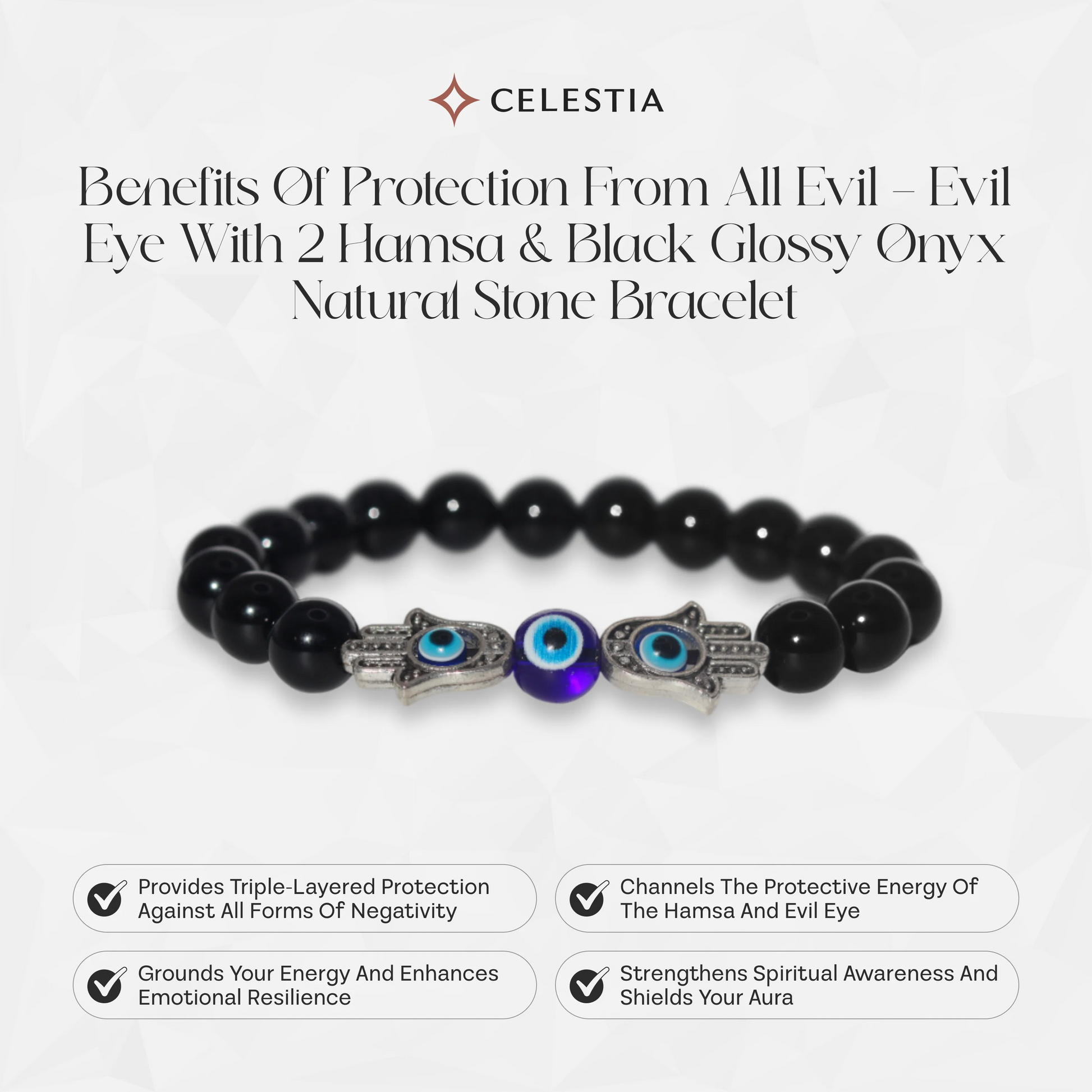 Safeguard your spirit with the Protection from All Evil - Evil Eye with 2 Hamsa & Black Glossy Onyx Natural Stone Bracelet from Celestia. This powerful Evil Eye Bracelet combines the ancient protective symbols of the Evil Eye and dual Hamsa hands with the grounding strength of black glossy onyx, creating a spiritual bracelet designed to shield against negativity and harm. Perfect for those seeking robust spiritual protection, this natural stone bracelet blends potency with striking elegance.