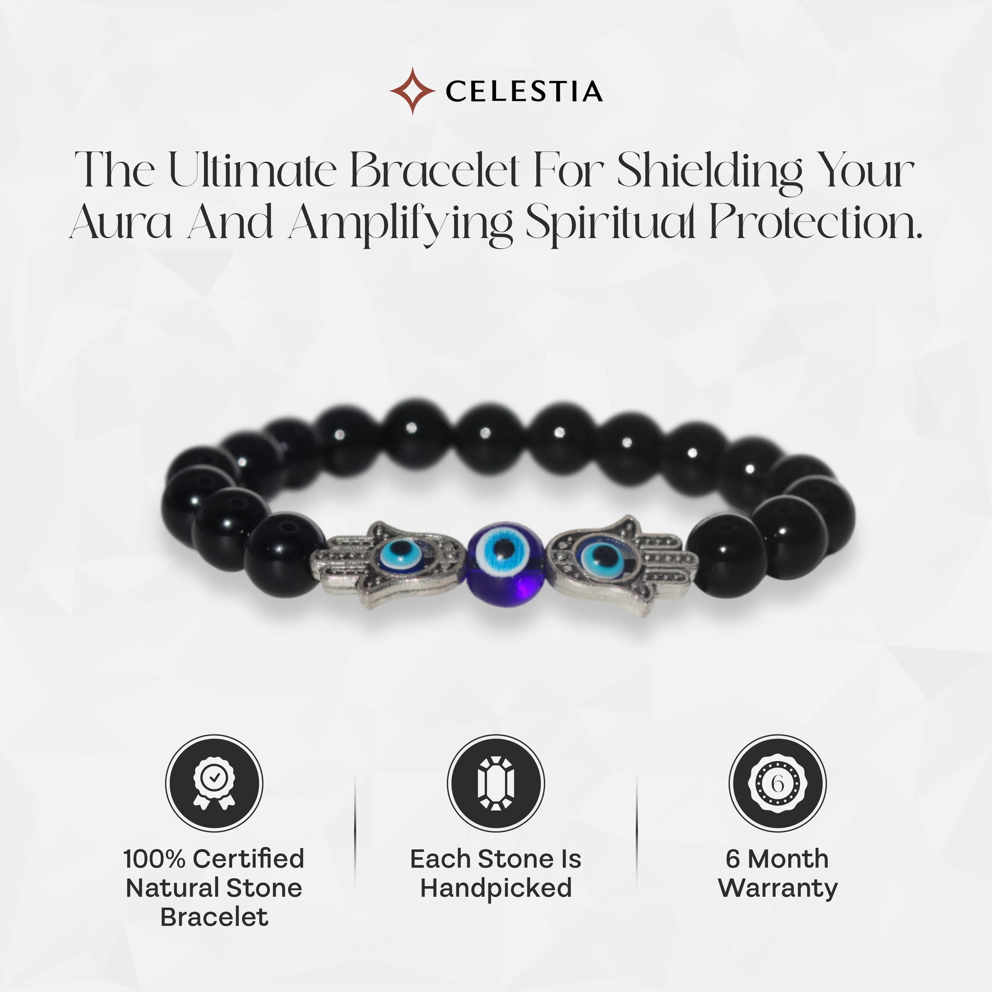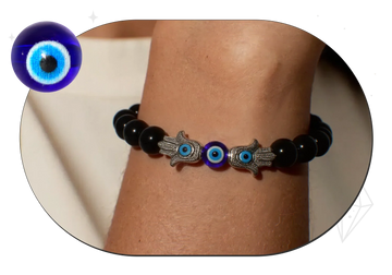 At Celestia, we craft with purpose and power. The Protection from All Evil - Evil Eye with 2 Hamsa & Black Glossy Onyx Natural Stone Bracelet harnesses the Evil Eye to deflect envy, the Hamsa for double-layered defense, and black onyx to absorb and transform negative energy. Whether worn during meditation, daily challenges, or as a bold accessory, this spiritual bracelet offers unwavering protection and peace of mind.
